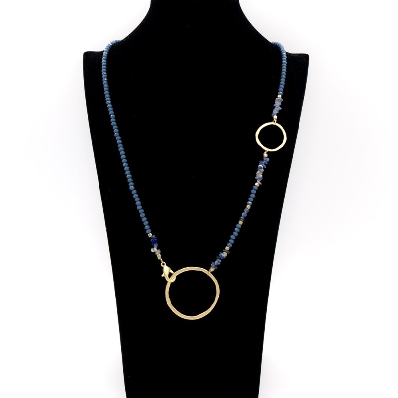 Colgante hecho a mano con cuentas de cristal y piedras naturales, los aros son de acero inoxidable en dorado, donde podrás colgar tus gafas y tenerlas siempre a mano.