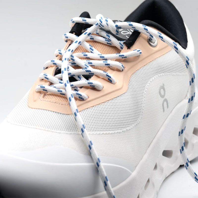 Cordones redondos, de aprox. 4mm de diámetro. BLANCO CON PICAS AZULES. Fabricados en España.