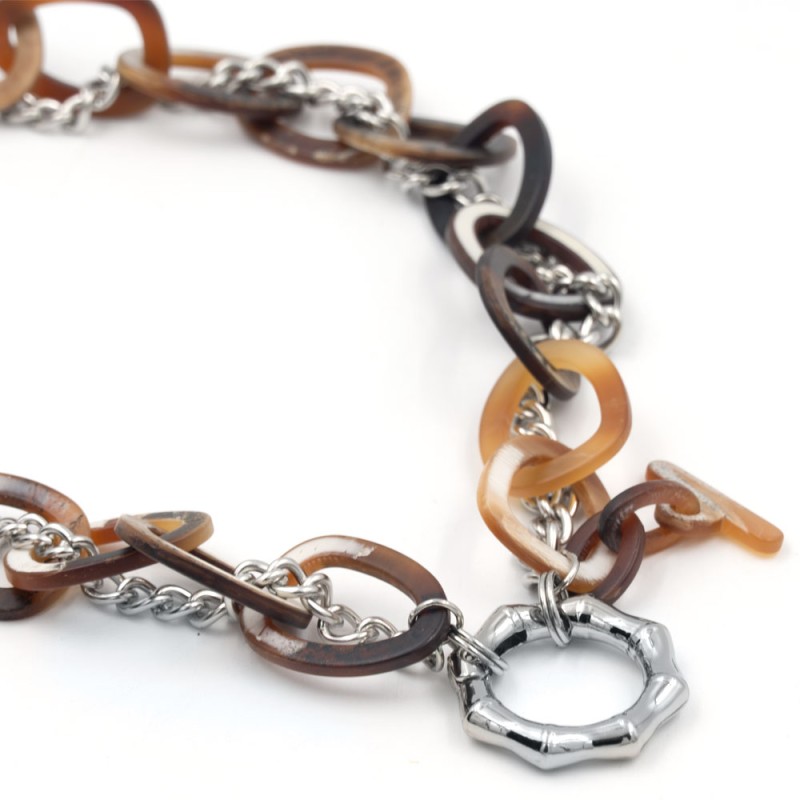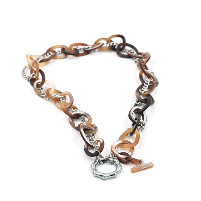 Colgante fabricado artesanalmente en España con resina, cadena de acero inoxidable y aro plateado donde colgar tus gafas.