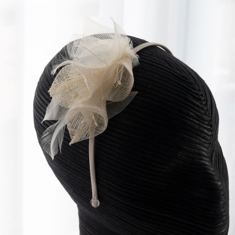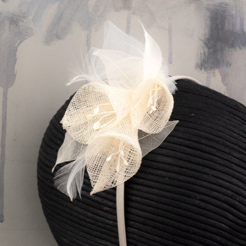Con cordón de raso, sinamay, tul, pistilos, esqueleto de hojas y plumas naturales.