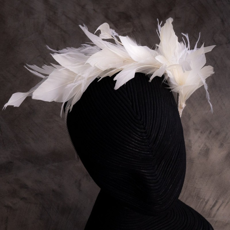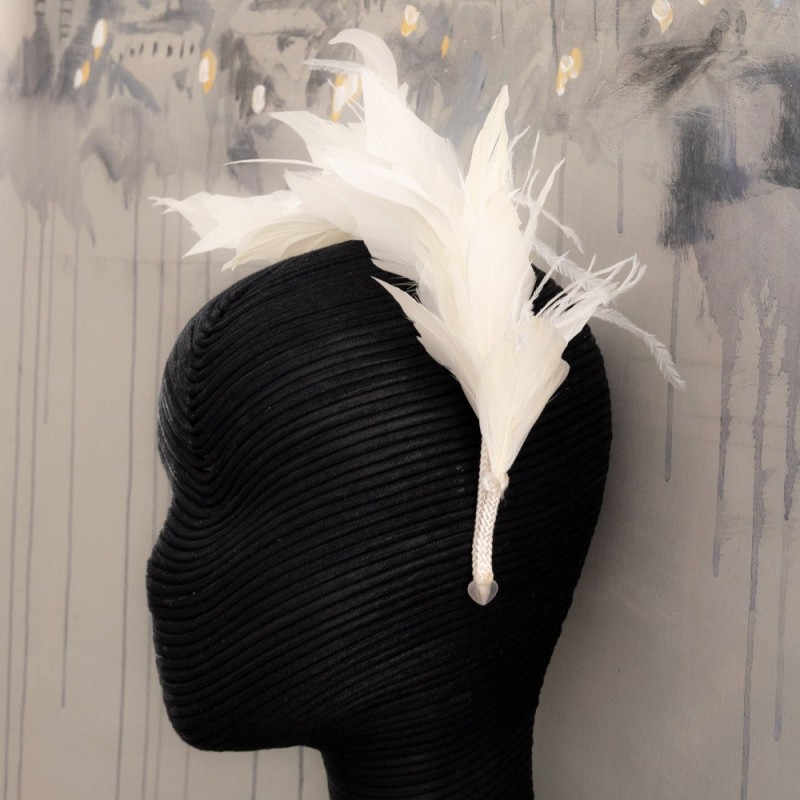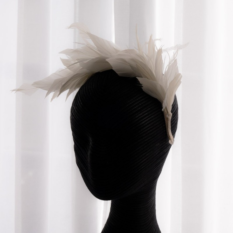 Diadema para novia, madrina, arras o para cualquier día que quieras sentirte especial. Hecha con cordón de rayón trenzado y plumas naturales.